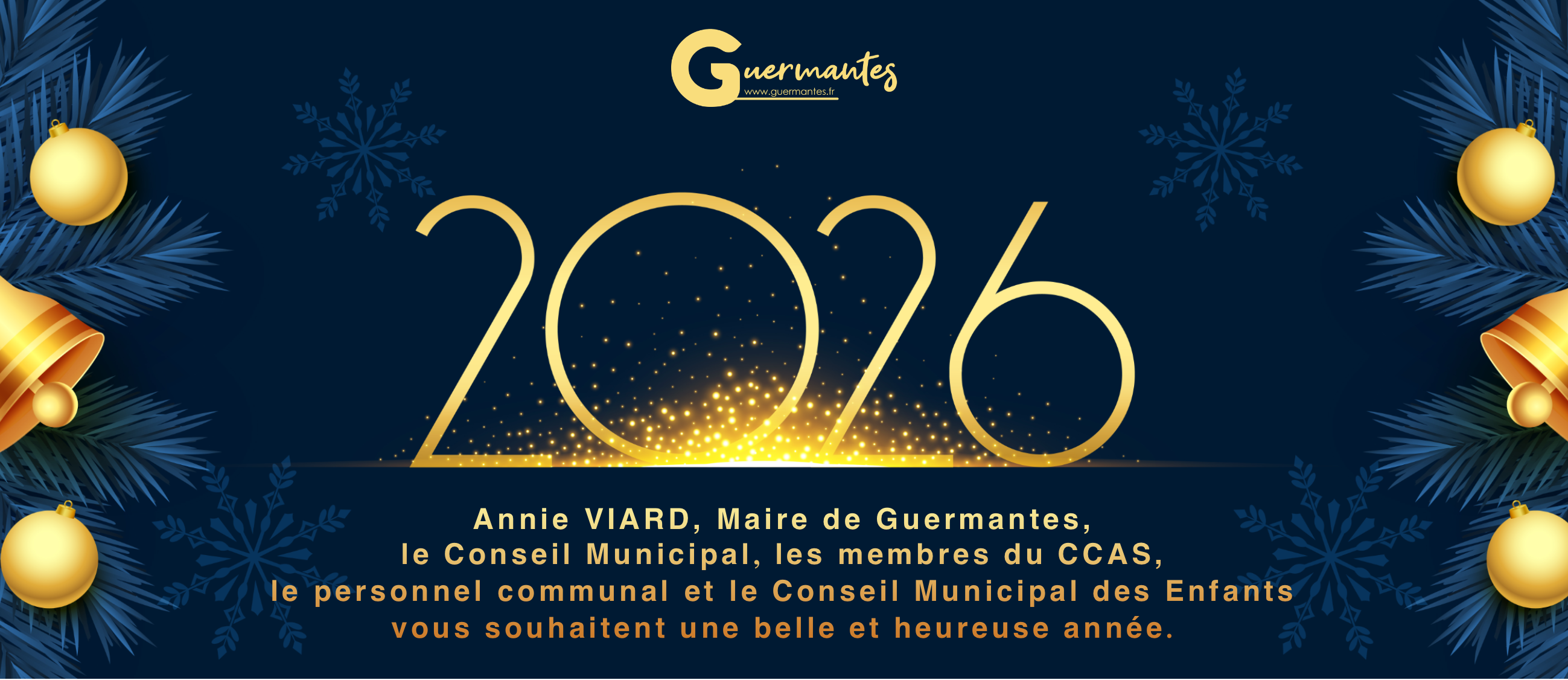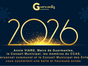 Vie locale Bonne année 2026 Annie VIARD, Maire de Guermantes, le Conseil Municipal, les membres du CCAS, le personnel communal et le Conseil Municipal des Enfants vous souhaitent une belle et heureuse année 2026 ! Date de publication de la page et auteur de publication Créé le : 2/01/2026 Précédent Retour à la liste Suivant