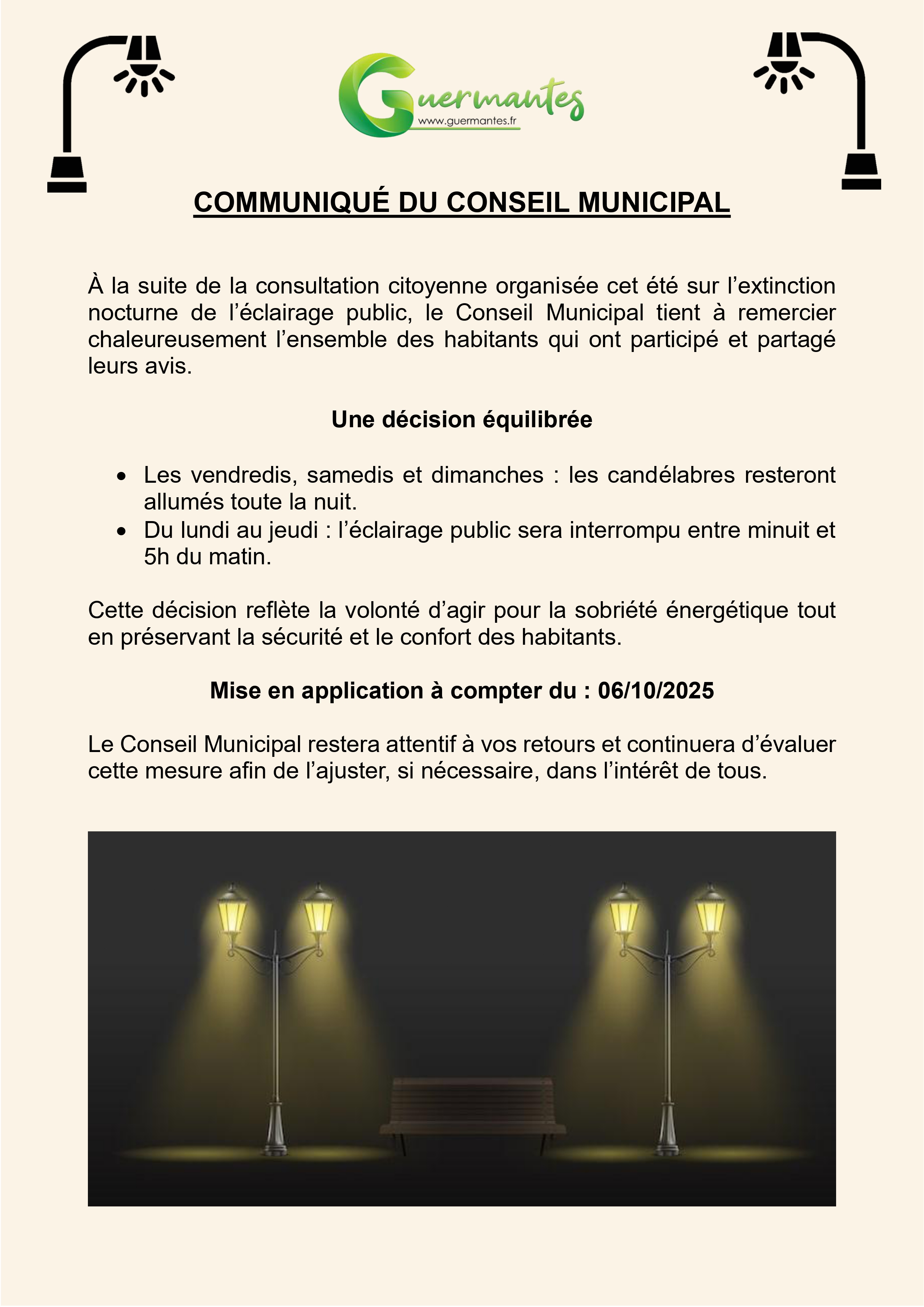 Voici un communiqué du Conseil Municipal concernant la décision prise pour l'éclairage public à Guermantes. La mise en application aura lieu dès le 6 octobre 2025.