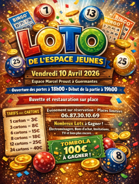 L'Espace Jeunes organise un loto le vendredi 10 avril 2026 à 18h à l'Espace Marcel Proust de Guermantes.