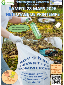 Les communes de Guermantes et Gouvernes organisent un nettoyage de printemps le samedi 28 mars 2026. Rendez-vous place devant les commerces à 9h30. Un verre de l'amitié sera offert aux participants à 12h à Gouvernes.