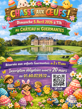La municipalité de organise une nouvelle édition de la chasse aux œufs de Guermantes le dimanche 5 avril 2026 à 11h au château de Guermantes.