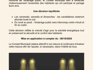 Voici un communiqué du Conseil Municipal concernant la décision prise pour l'éclairage public à Guermantes. La mise en application aura lieu dès le 6 octobre 2025.