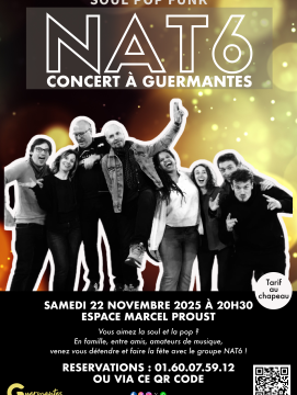 Le groupe NAT6 vous propose un concert de Soul/Pop/Funk le samedi 22 novembre 025 à 20h30 à l'Espace Marcel Proust.