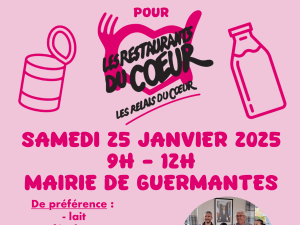 La municipalité de Guermantes et le Conseil Municipal des Enfants organisent une collecte au profit des "Restos du Cœur" le samedi 25 janvier 2025 en mairie. Merci de privilégier les dons de denrées non périssables tels que du lait, des féculents (pates, riz, semoule), des conserves de poissons et des conserves de légumes.