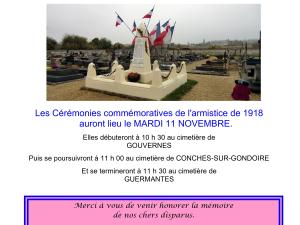 Les cérémonies commémoratives de l'Armistice de 1918 auront lieu le mardi 11 novembre 2025 et débuteront au cimetière de Gouvernes à 10h30, se poursuivront à Conches sur Gondoire à 11h et se termineront à 11h30 à Guermantes. Un verre du souvenir sera offert ensuite par l'association des Anciens Combattants à l'Espace Marcel Proust de Guermantes.