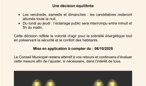 Voici un communiqué du Conseil Municipal concernant la décision prise pour l'éclairage public à Guermantes. La mise en application aura lieu dès le 6 octobre 2025.