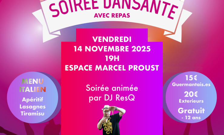 La municipalité de Guermantes organise une soirée dansante avec repas le vendredi 14 novembre 2025 à 19h à l'Espace Marcel Proust avec la présence du DJ ResQ.